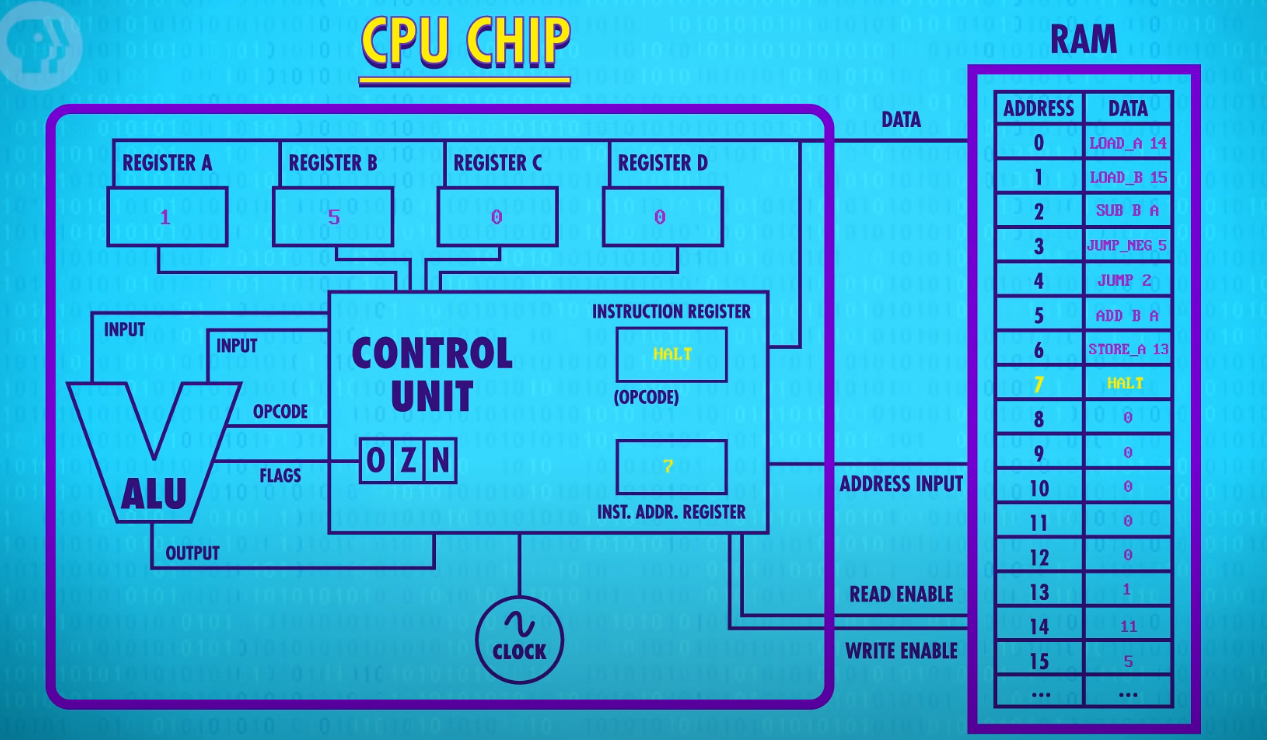 조건부 Jump 절이라고 볼 수 있다. 이러한 조건부 Jump는 Neg 외에도 Equal, Greater등이 있다고 한다. - 램 7번에 저장되어 있는 Halt라는 명령어는